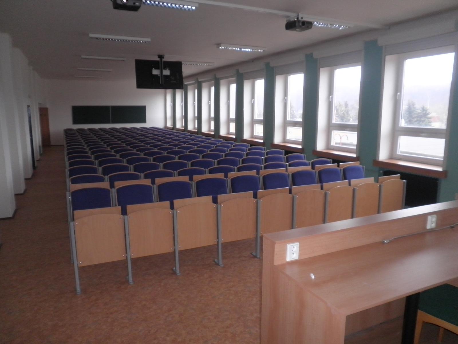 základní ozvučení (2 - 6 reproduktorů, mikrofon), tabule, 2 dataprojektory, PC, vizualizér, zatemnění, připojení k internetu - wifi |