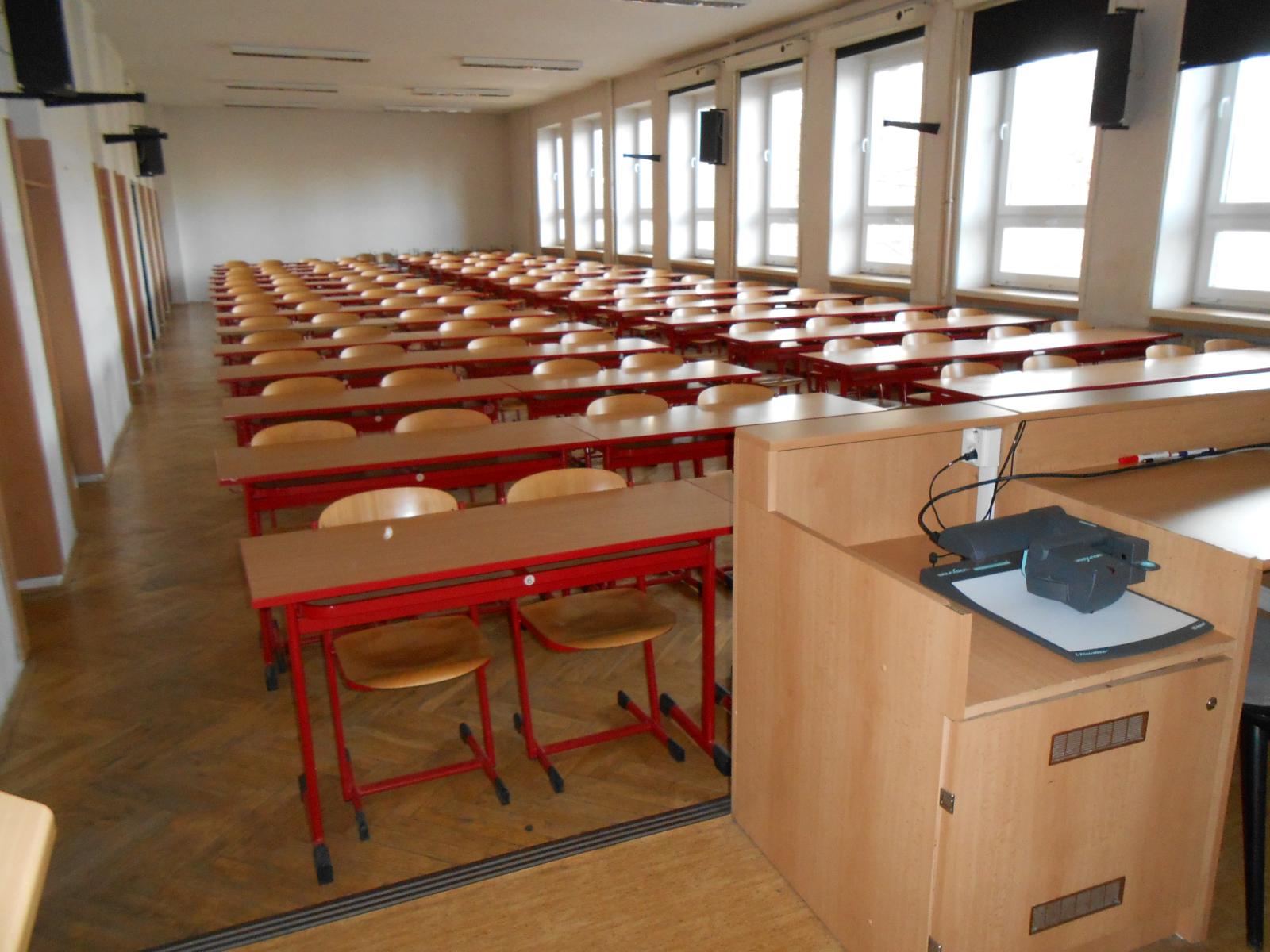 základní ozvučení (4 reproduktory, mikrofon), tabule, 2 dataprojektory, PC, vizualizér, zatemnění, připojení k internetu - wifi |